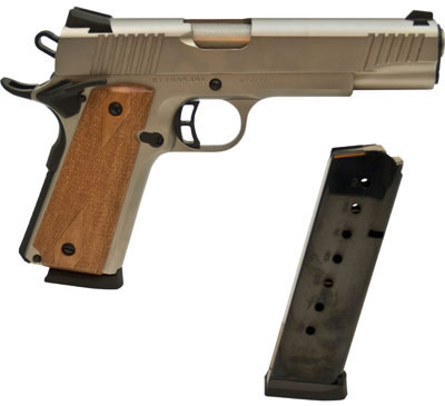 Citadel M1911 features Series 70 Firing System, forged steel frame and slide, skeletonized hammer and trigger, Novak style sights, lower and flared ejection ports, positive extended beaver-tail grip safety and 1911 round trigger guard. Lockable hard plastic case included. These full size models are available in brushed nickel or black with checkered wooden grips.