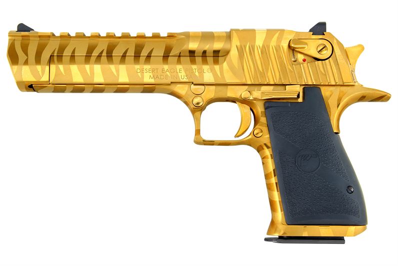 This Desert Eagle Titanium Gold pistol features an authentic Bengal Tiger Stripe Pattern.