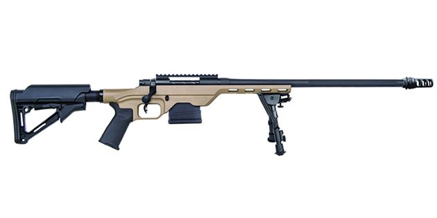 This AR magazine-compatible (M1A/M14 and AR10-style) MVP LC 6.5 Creedmoor bolt-action is housed in an aluminum, tan-finished, light chassis stock designed by MDT® that provides a modular, ergonomic base. The free-floating, 20-inch medium-bull barrel is threaded and comes with a SilencerCo® Saker™ muzzle brake. Magpul® Mil-Spec CTR® adjustable stock, MOE® pistol grip and adjustable bipod complete the MVP LC package. Additional design features include: spiral fluted bolt; oversized tactical-style bolt handle; and Picatinny top rail for ease of adding optics. MVP-LC rifles come standard with a Magpul P-Mag® 10-round magazine.