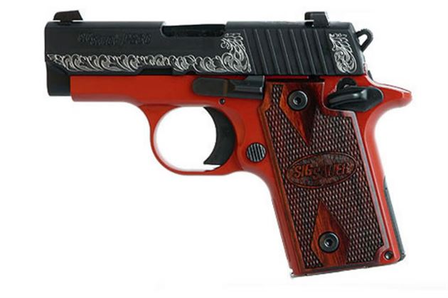 THE P238 LADY, It’s just a fraction of the size of the Sig Sauer full-size pistols. A smart looking, small handgun built with the same accuracy and reliability as large frame Sig Sauer pistols. With an overall length of just 5.5 inches a height of 3.96 inches, and weighing just 15.2 ounces, the SIG SAUER P238 is the ultimate firepower in an all metal frame concealed pistol. The P238 is built on an red Cerakote™ alloy beavertail style frame, Nitron® finished slide with scroll engraving with gold flower inlay, and rosewood grips checkered for a secure hold during usage.