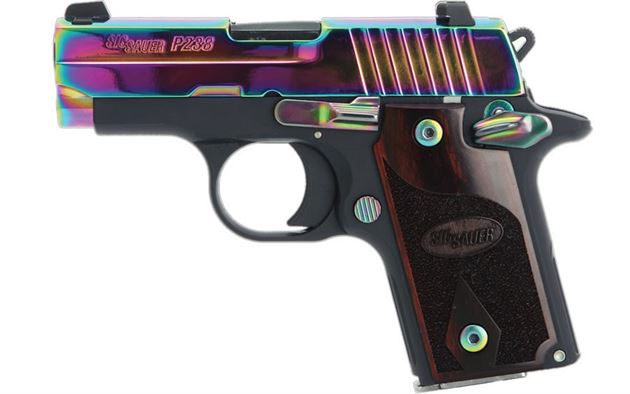 The P238 Special Edition Rainbow pistol from Sig Sauer comes with a Titanium finish and Rosewood Grips. The stainless steel slide features the popular trademarked Sig Sauer slide serrations, corrosion resistant Rainbow Titanium finish and SIGLITE® Night Sights.